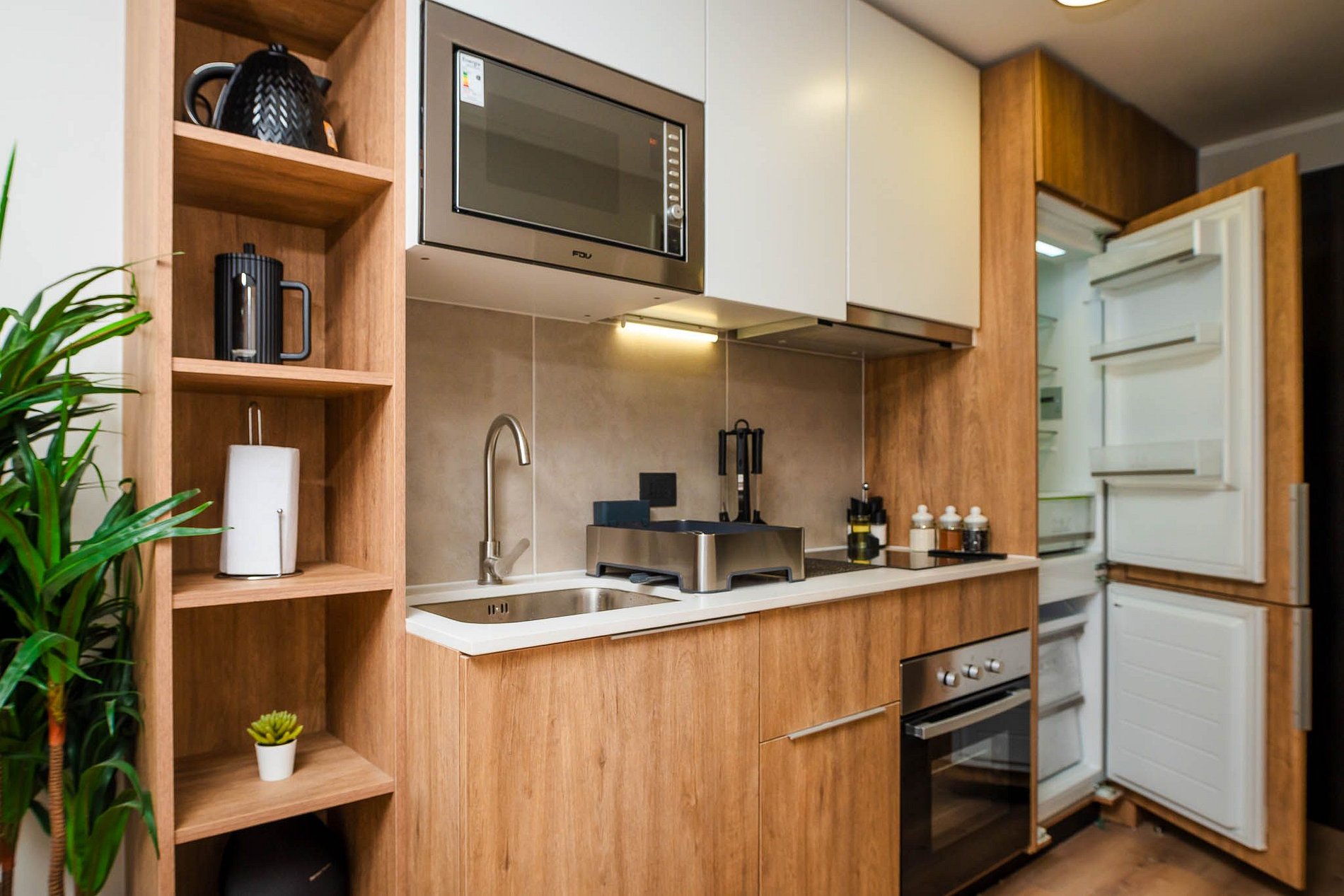This modern studio blends comfort, intention, and clarity: a premium bed for deep rest, blackout curtains for quiet mornings, fast WiFi to fuel your productivity, and a fully equipped kitchen to keep your routines steady.